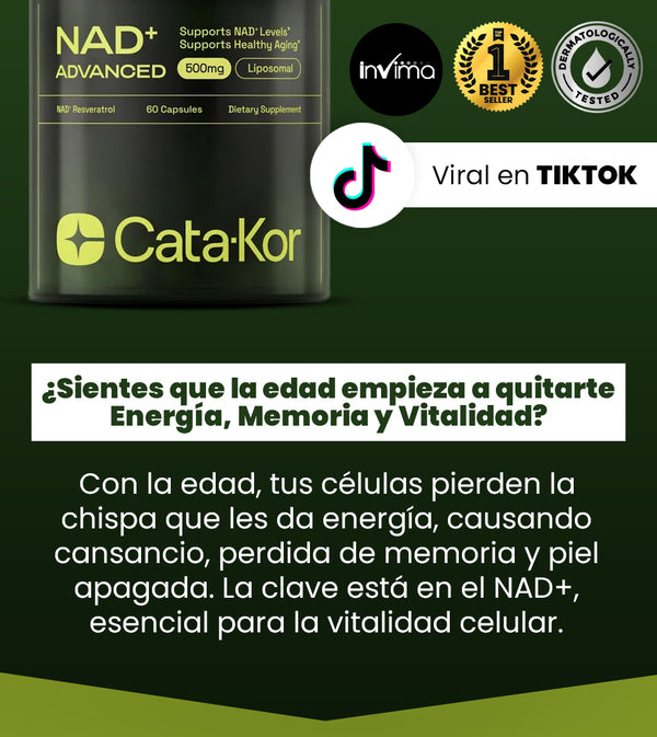 El NAD+ es una coenzima esencial que ayuda a tus células a producir energía. Sus niveles disminuyen con la edad, lo que causa fatiga, envejecimiento prematuro y menor claridad mental.